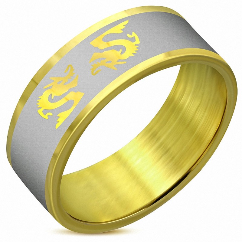 • 8mm | Bague en bande plate avec deux signes de zodiaque chinois Dragon en acier inoxydable plaqué or