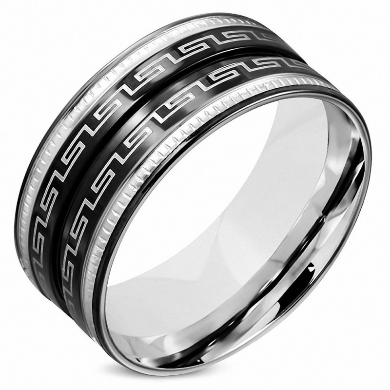 • 10mm | Bague de bande de coupe confortable avec bord de bobine rayé de clé grecque 2 tons en acier inoxydable