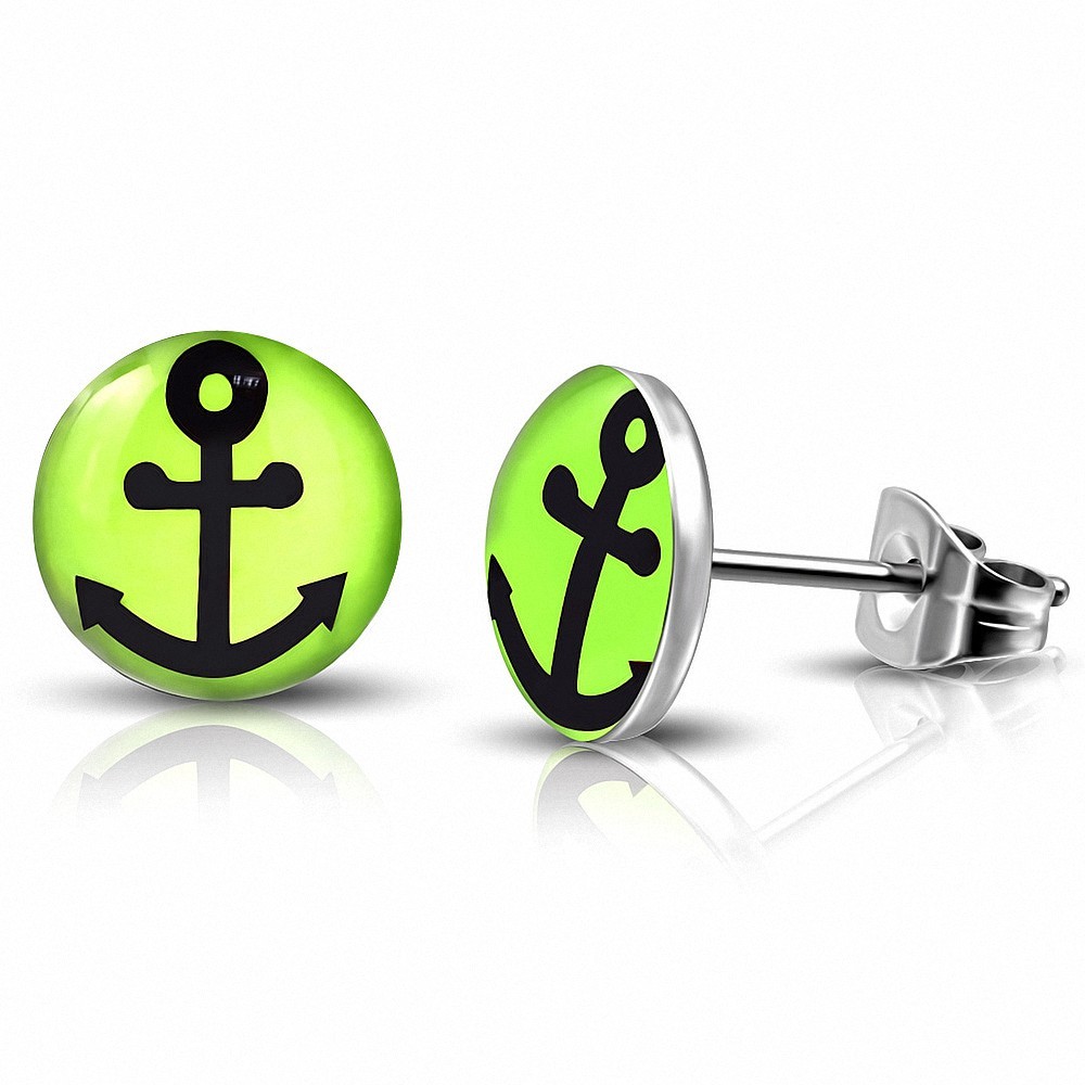 7mm | Boucles d'oreilles clous en acier inoxydable 3 tons marines avec cercle vert (Paire)