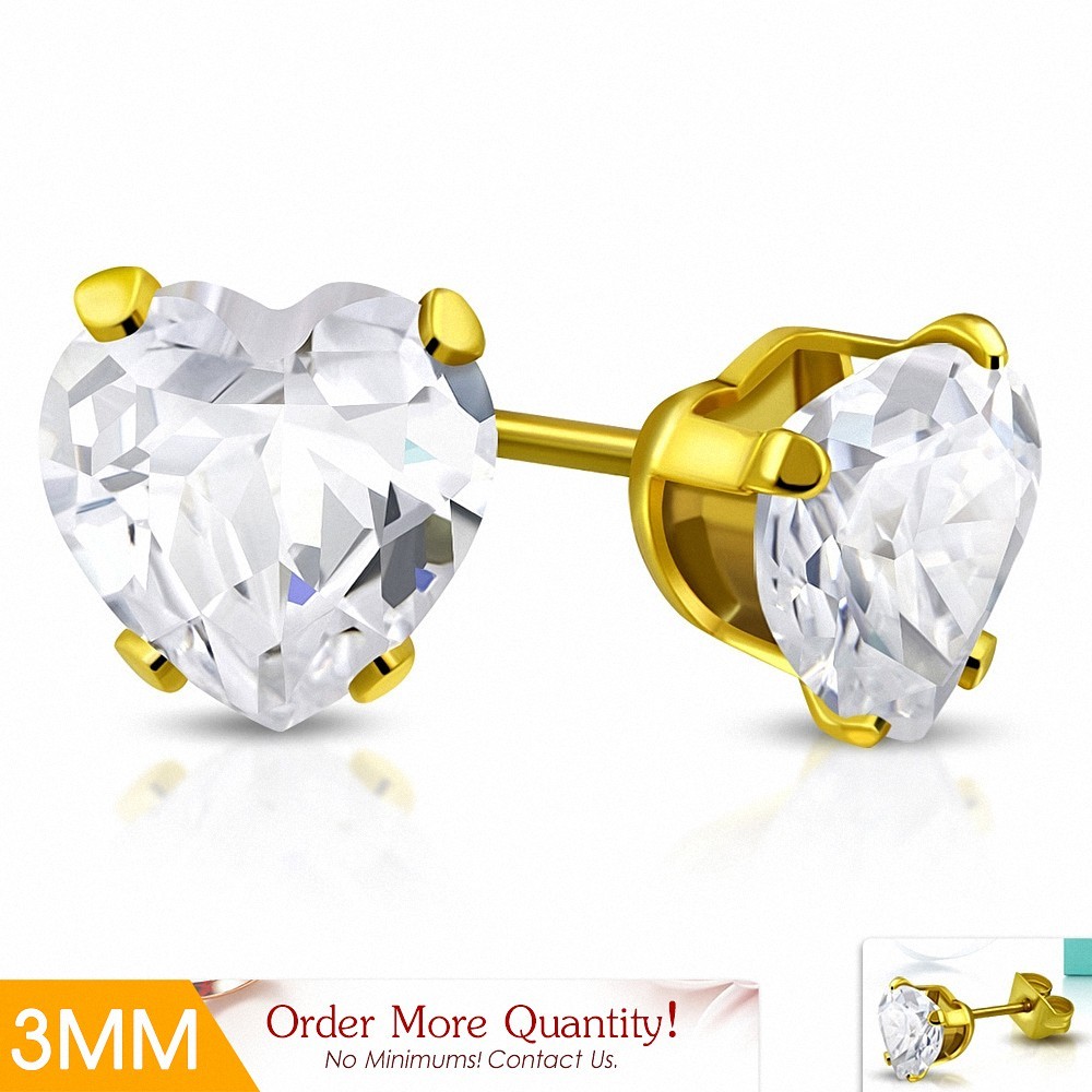 • 3mm | Boucles d'oreille en forme de coeur en forme de coeur en acier inoxydable doré avec  Clear CZ (paire)