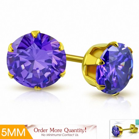 5mm | Boucles d'oreille rondes en acier inoxydable doré avec chaîne et serti de griffes - Violet / Violet CZ (paire)