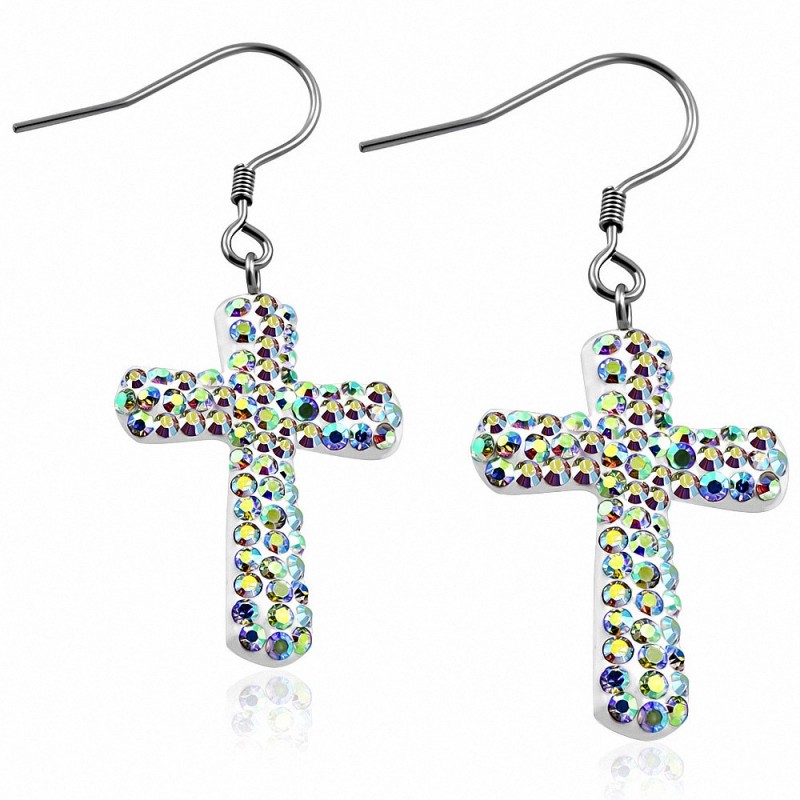 Boucles d'oreilles à crochet long avec croix en acier inoxydable avec Aurore Boreale CZ (paire)