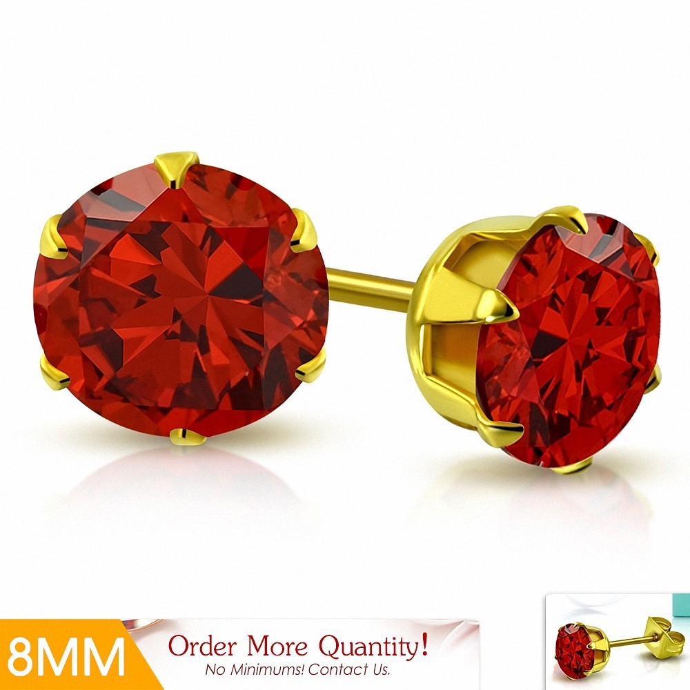 8mm | Boucles d'oreille rondes en acier inoxydable doré avec rondelles et clouss avec  Light Siam Red CZ (paire)
