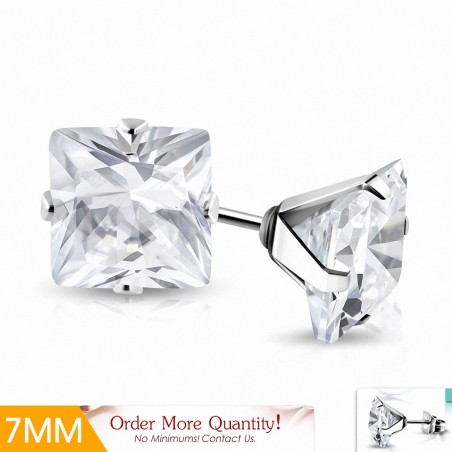 7mm | Boucles d'oreilles clous carrées en acier inoxydable avec  Clear CZ (paire)