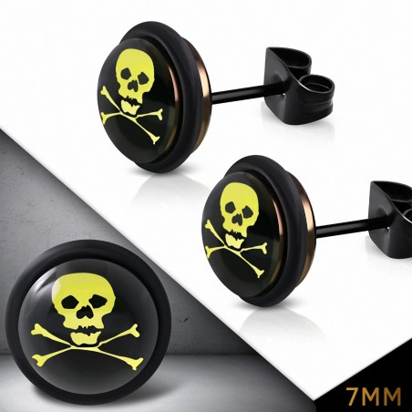 7mm | Boucles d'oreilles clous en acier inoxydable à crâne avec deux tons, acier inoxydable noir et joints (paire)