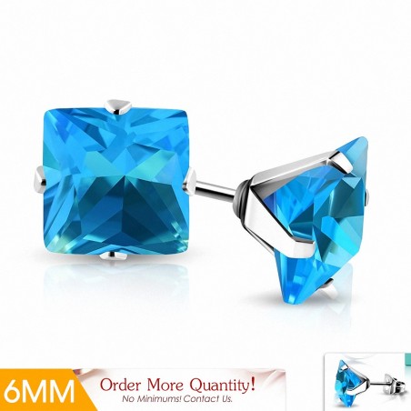 • 6mm | Boucles d'oreilles carrées en acier inoxydable avec griffes bleu ciel / aigue-marine CZ (paire)