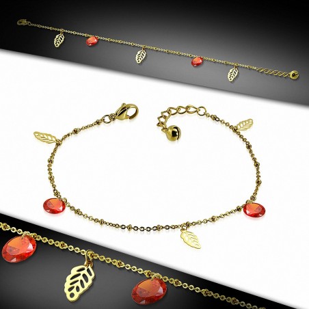 • Bracelet à breloques en forme de feuille en acier inoxydable doré avec chaîne / chaîne d'extension et opale de feu orange CZ