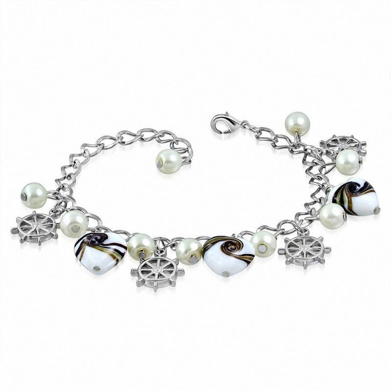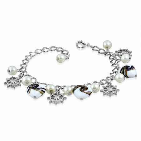 Alliage de mode blanc perle amour coeur verre perle casque / bracelet à mailles de charm de roue