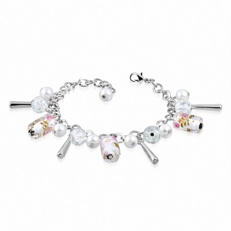 • Alliage de mode blanc perle de verre perle Rose fleur Tube Bracelet de lien de chaîne charm