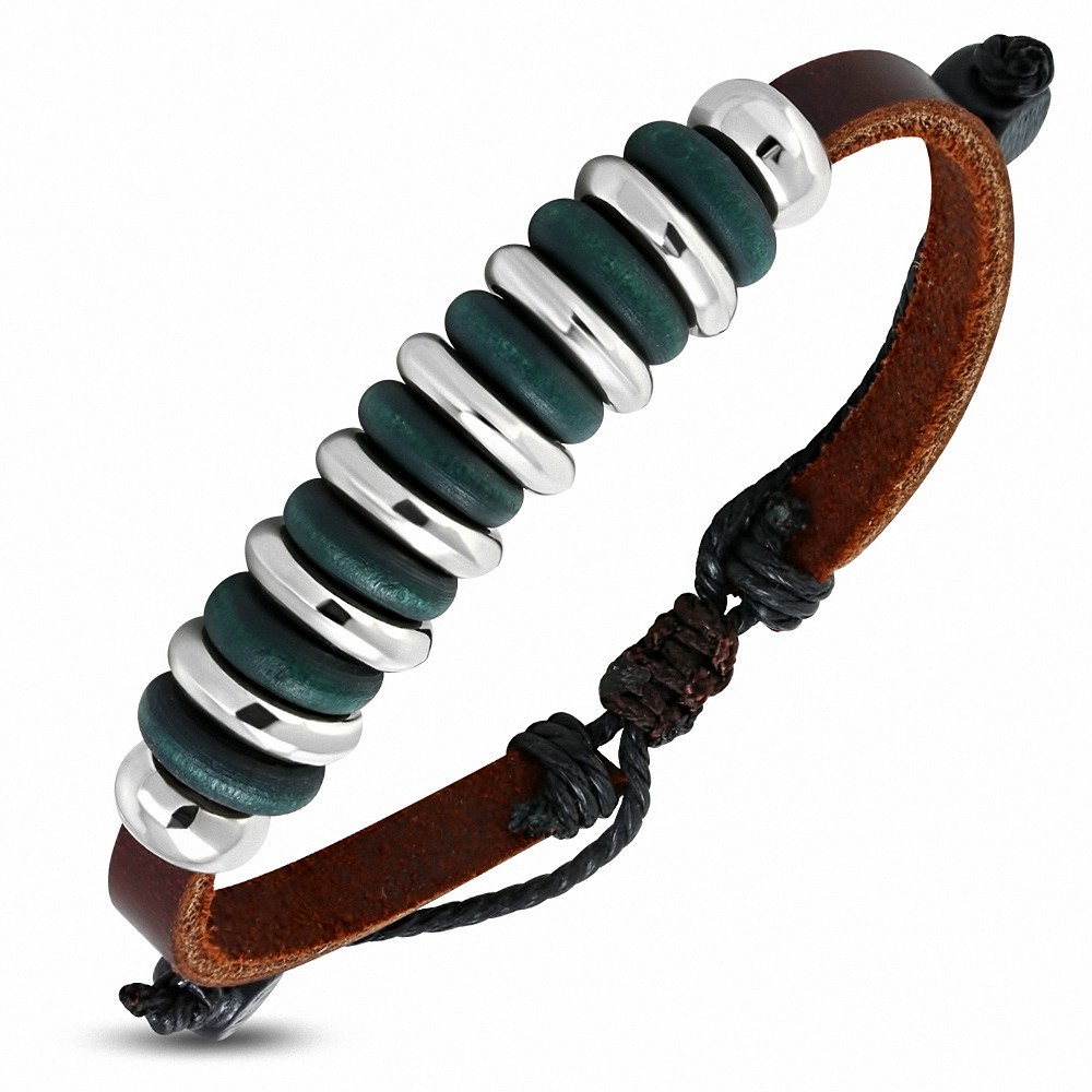 Bracelet ajustable en cuir marron avec perle en bois et corde
