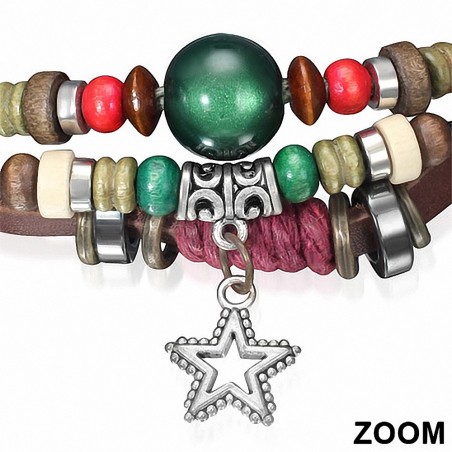 • Bracelet réglable en cuir marron à breloques en perles de bois à la mode en forme de triple corde Bali