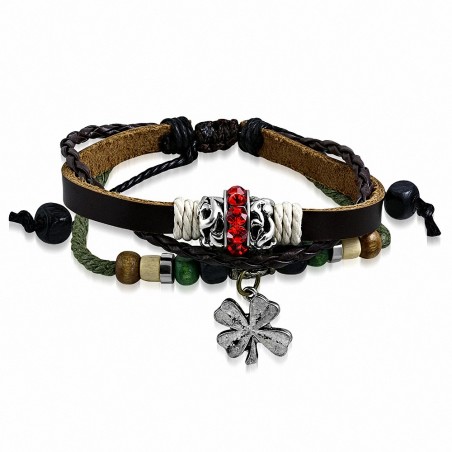 • Bracelet en cuir avec breloque fantaisie en forme de fleur de perle de shamrock en bois de Bali réglable rouge clair