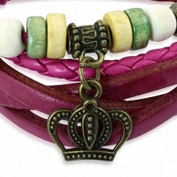 Bracelet multi-rangées en perles de bois de Bali, princesse royale, couronne, breloque en cuir rose avec bracelet pression