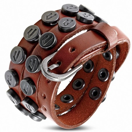 • Bracelet en cuir véritable marron rond avec clous et boucle de ceinture