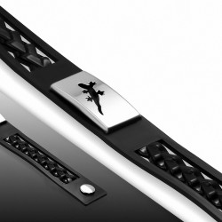 Bracelet pour homme en caoutchouc noir, avec une plaque en acier inoxydable représentant un lézard.