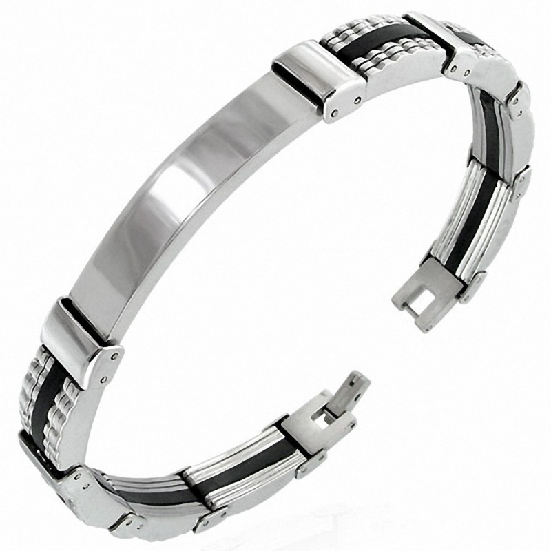 Bracelet pour homme en acier inoxydable et caoutchouc noir, avec une plaque pouvant être gravée.