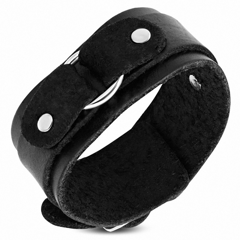 Bracelet pour homme en cuir noir, avec une boucle de ceinture ronde.
