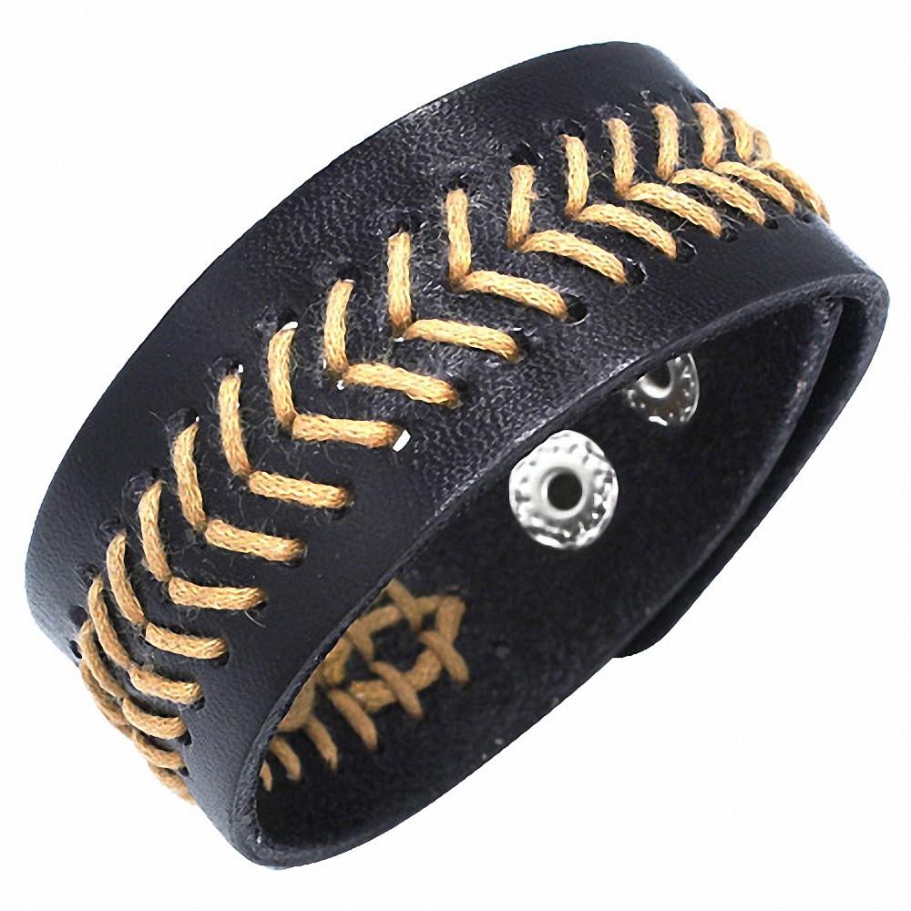 Bracelet pour hommes, en cuir noir, avec de la corde jaune foncé piquée en chevrons.