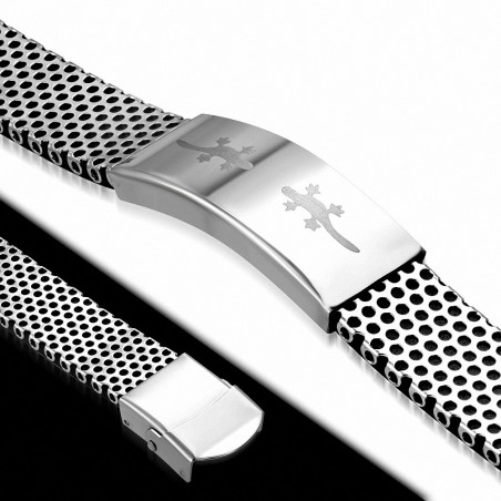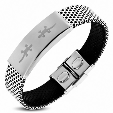 Bracelet pour homme en caoutchouc noir et en acier inoxydable, avec une plaque représentant deux lézards.