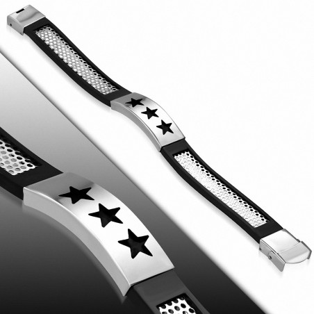 Bracelet pour homme en caoutchouc noir et en acier inoxydable, avec une plaque représentant trois étoiles.