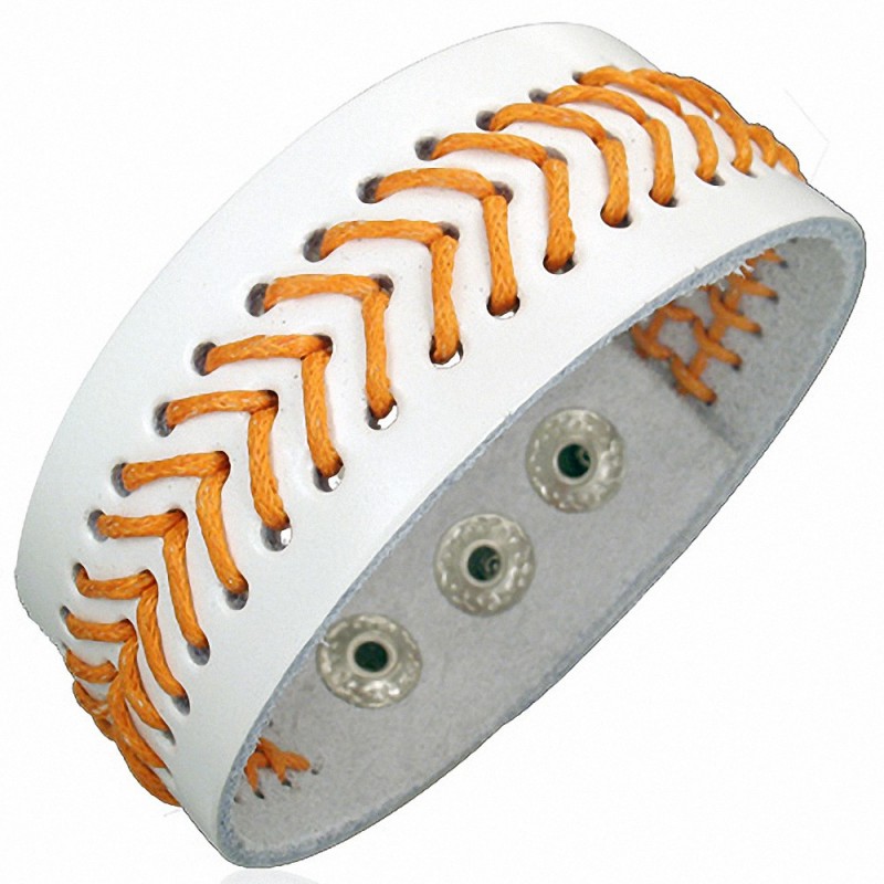 Bracelet large pour homme en cuir blanc et chevrons en corde orange.