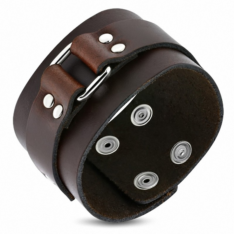 • Bracelet en cuir brun véritable avec boucle de ceinture et bouton pression A