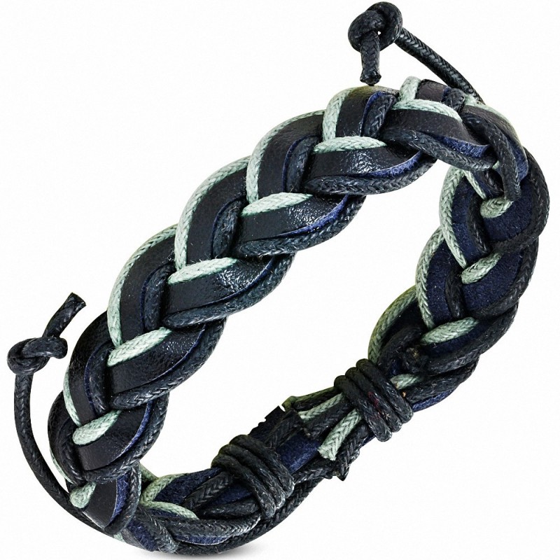 Bracelet réglable en cuir noir tressé avec corde noire grise et bleu royal
