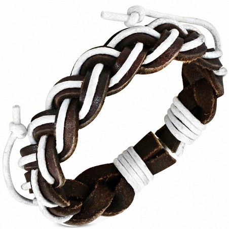 Bracelet en cuir marron ajustable tressé avec corde blanche