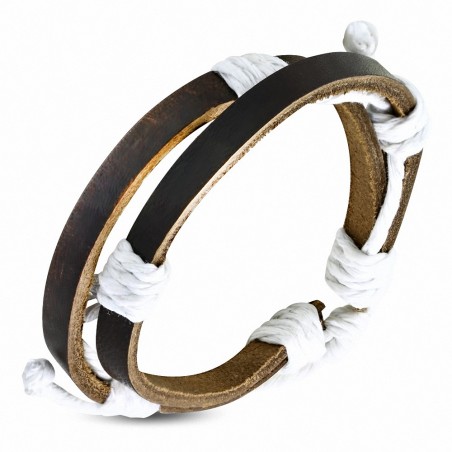 • Bracelet ajustable 2 lanières en cuir brun avec corde blanche 2