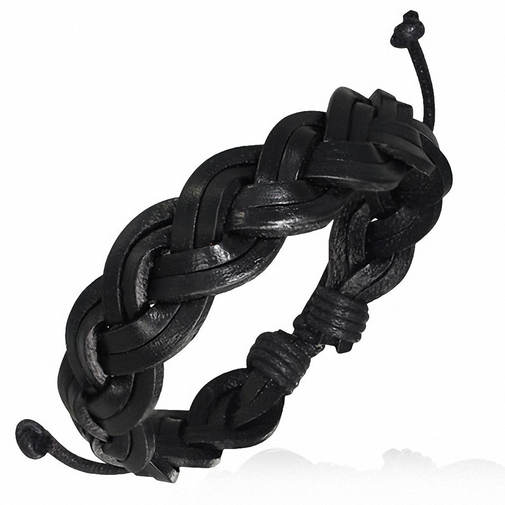 Bracelet ajustable tressé en lanières carrées de cuir noir