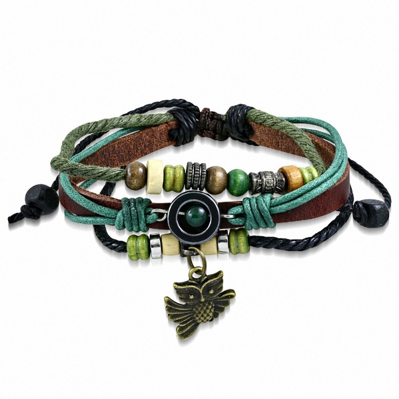 Bracelet ajustable en cuir marron avec breloque perle de hibou en perles de bois  Triple Wrap