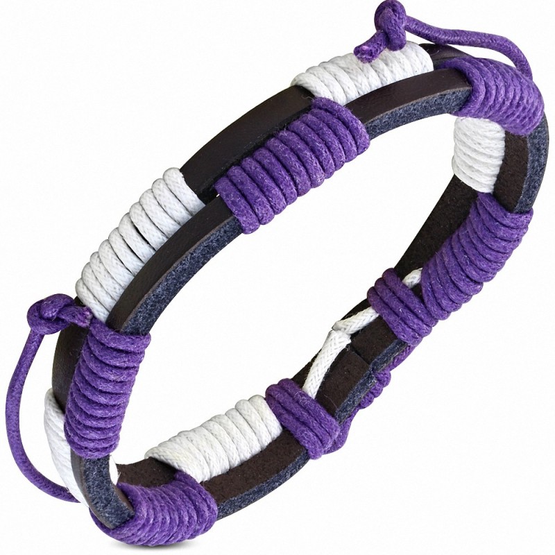 • Bracelet ajustable en cuir noir à double enroulement blanc et violet