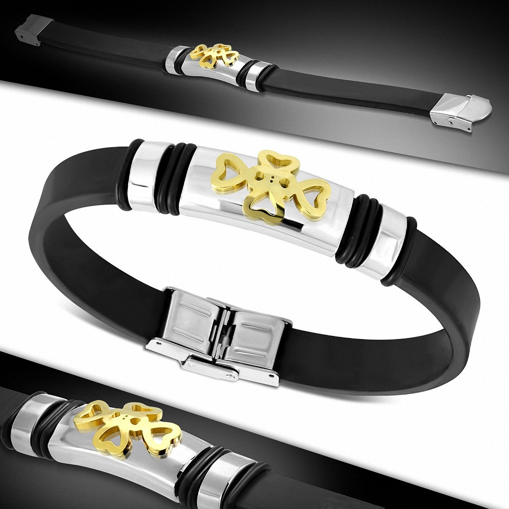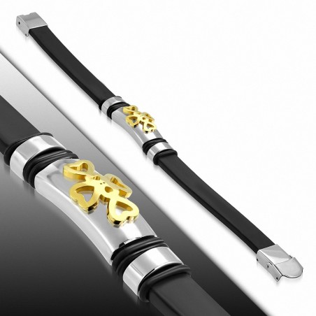 • Bracelet en caoutchouc noir avec montre en forme de coeur d'amour croisé en acier inoxydable 2 tons B