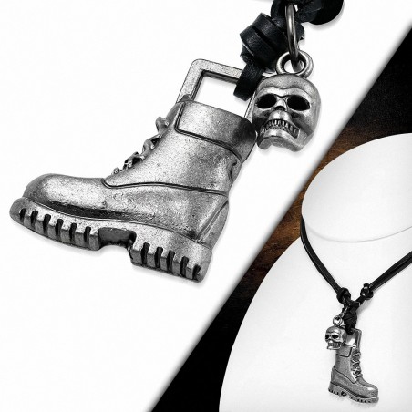Alliage de mode 2-ton botte de cox boy crâne charm réglable noir collier de motard en cuir véritable cuir