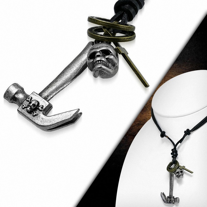 Collier pour homme en cuir noir, avec un ensemble de pendentifs représentant un crane, un marteau de charpentier, une croix latine et deux anneaux.