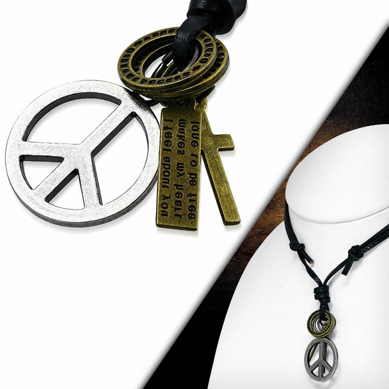 Alliage tag bague signe de la paix charm réglable collier en cuir noir