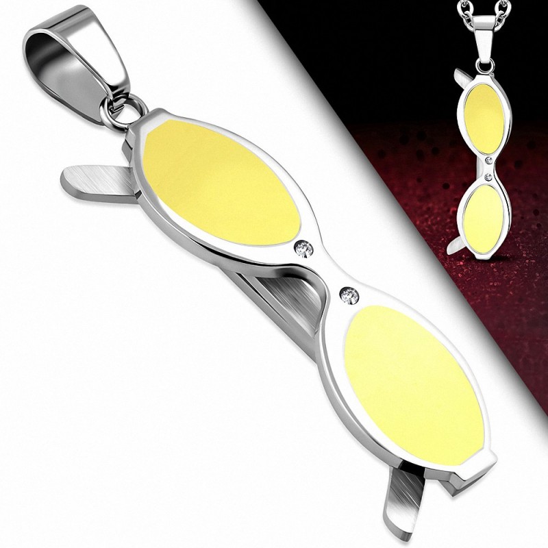 Pendentif pour homme en acier inoxydable, représentant une paire de lunettes, argenté et doré.