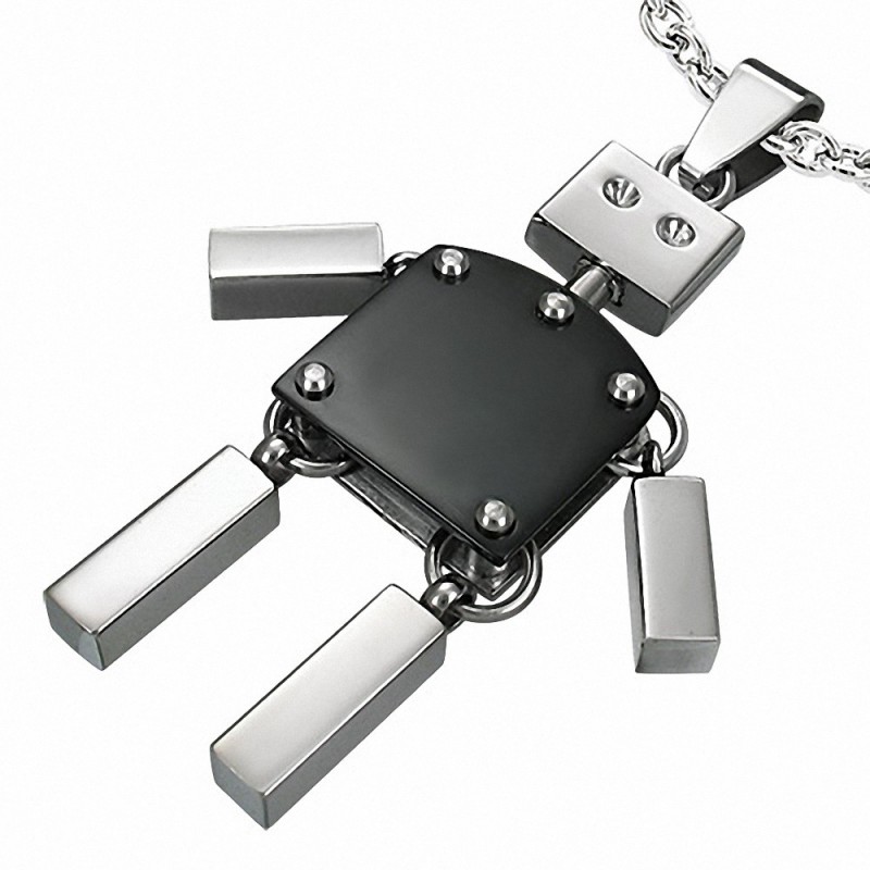 Pendentif pour homme en acier inoxydable, représentant un robot articulé, noir et argenté.