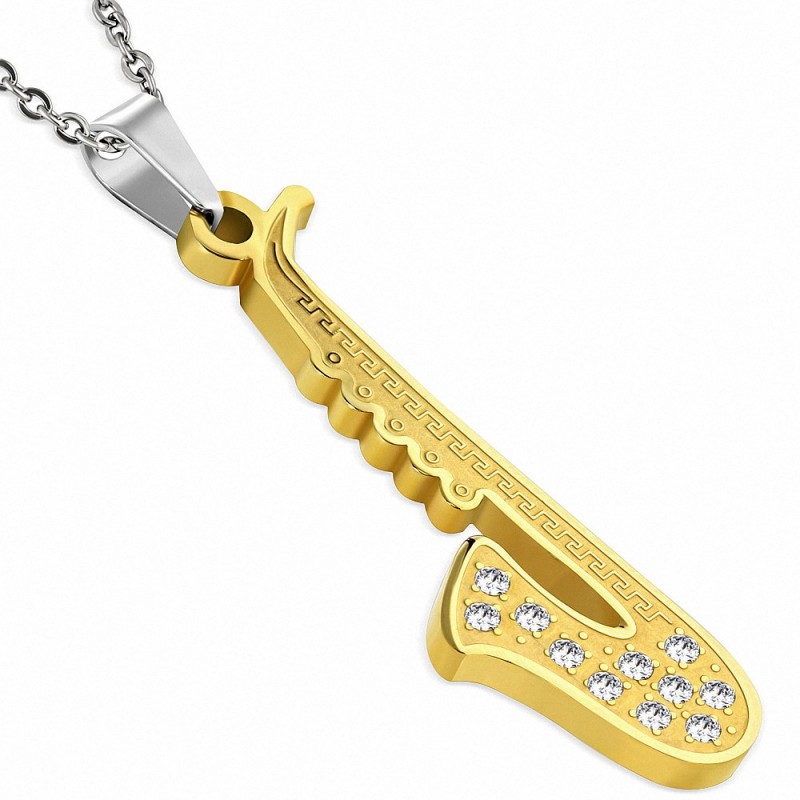Pendentif pour homme en acier inoxydable, représentant un saxophone doré, serti de gemmes.