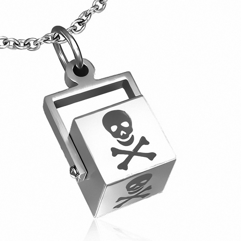 Pendentif pour hommes en acier inoxydable, en forme de cube, sur lequel est représente un crâne de pirate.