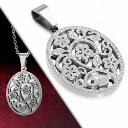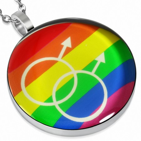 Pendentif pour homme en acier inoxydable, en forme de cercle, avec double sigle homme sur fond rainbow.