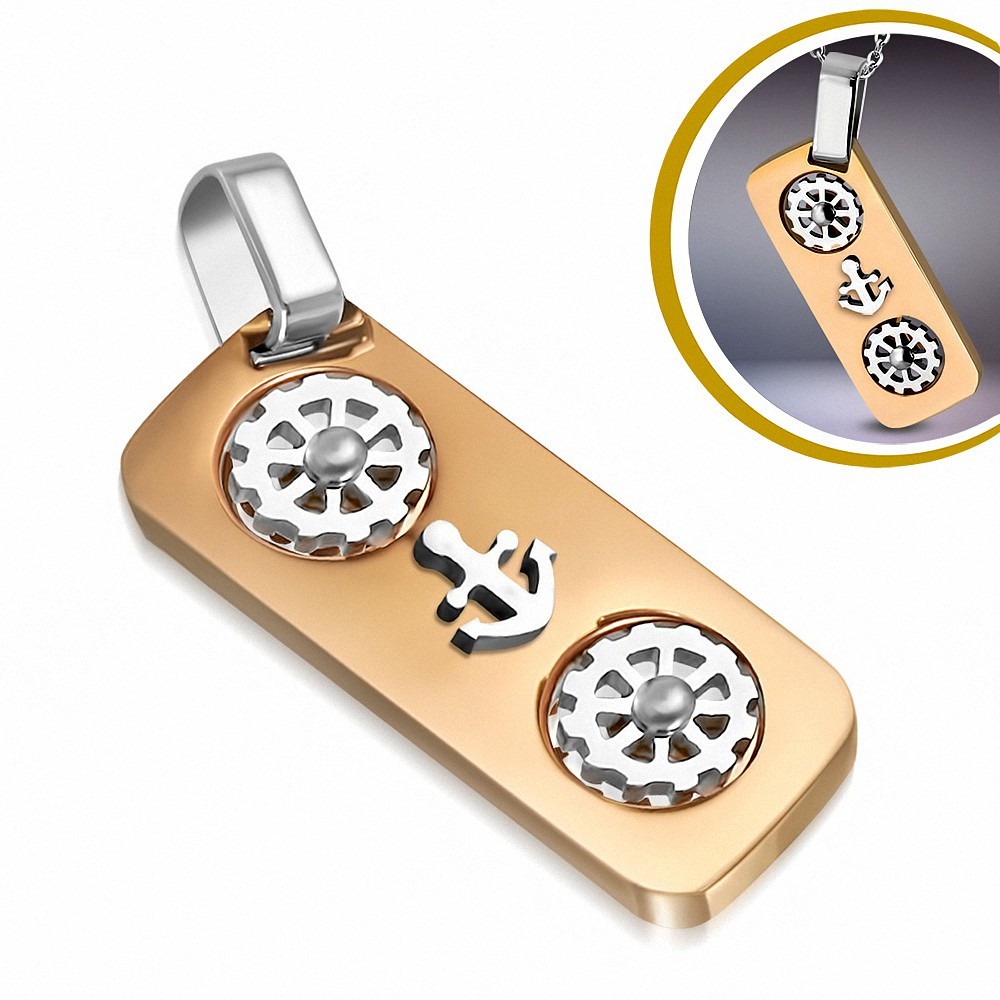 Pendentif pour homme en acier inoxydable représentant 2 barres de bateau et 1 ancre sur une base rectangulaire dorée.