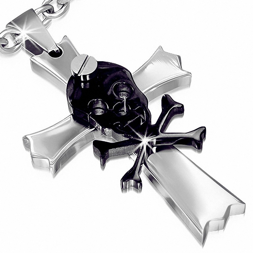 Collier pour hommes en cuir noir, avec un ensemble de pendentifs représentant un crane pirate, une croix latine, une plaque gravée et deux anneaux.