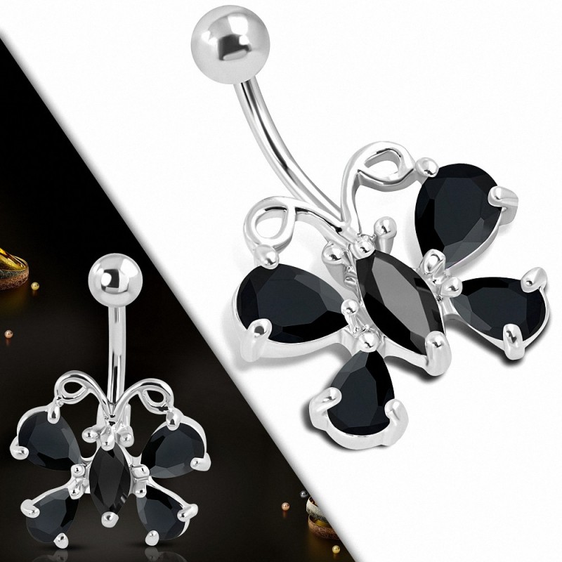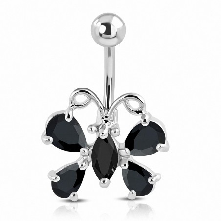 Breloque papillon en acier inoxydable pendantes nombril avec CZ noir jais | Boule-5mm | G-1,6 mm